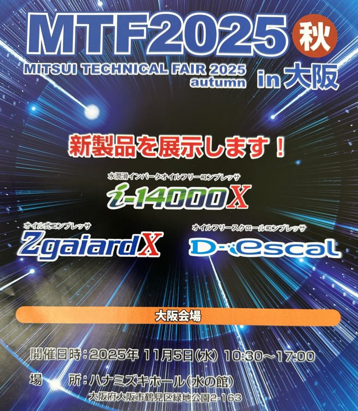 2025.11.07 トピックス 三井テクニカルフェア 新製品発表会 11月5日(水)MTF(三井テクニカルフェア)新製品発表会へ行ってきました。 7.5KW~15KWまでの新型コンプレッサが揃っており、今後、更新や新設、増設など皆様のお役に立つ商品であると思いますので、 是非ご検討など頂けましたら幸いです。 商品の詳細など是非お問合せ下さい。 (072-330-3261) « 前の記事へ 次の記事へ »