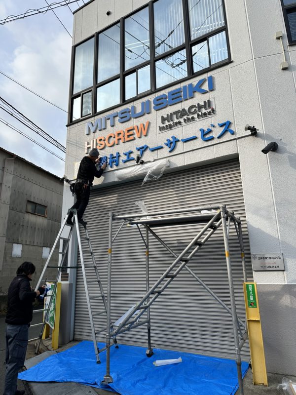 弊社社名の看板ですが、日差しの強さなどによる劣化の為痛んでおりましたので、年末に新しく取り替え致しました!